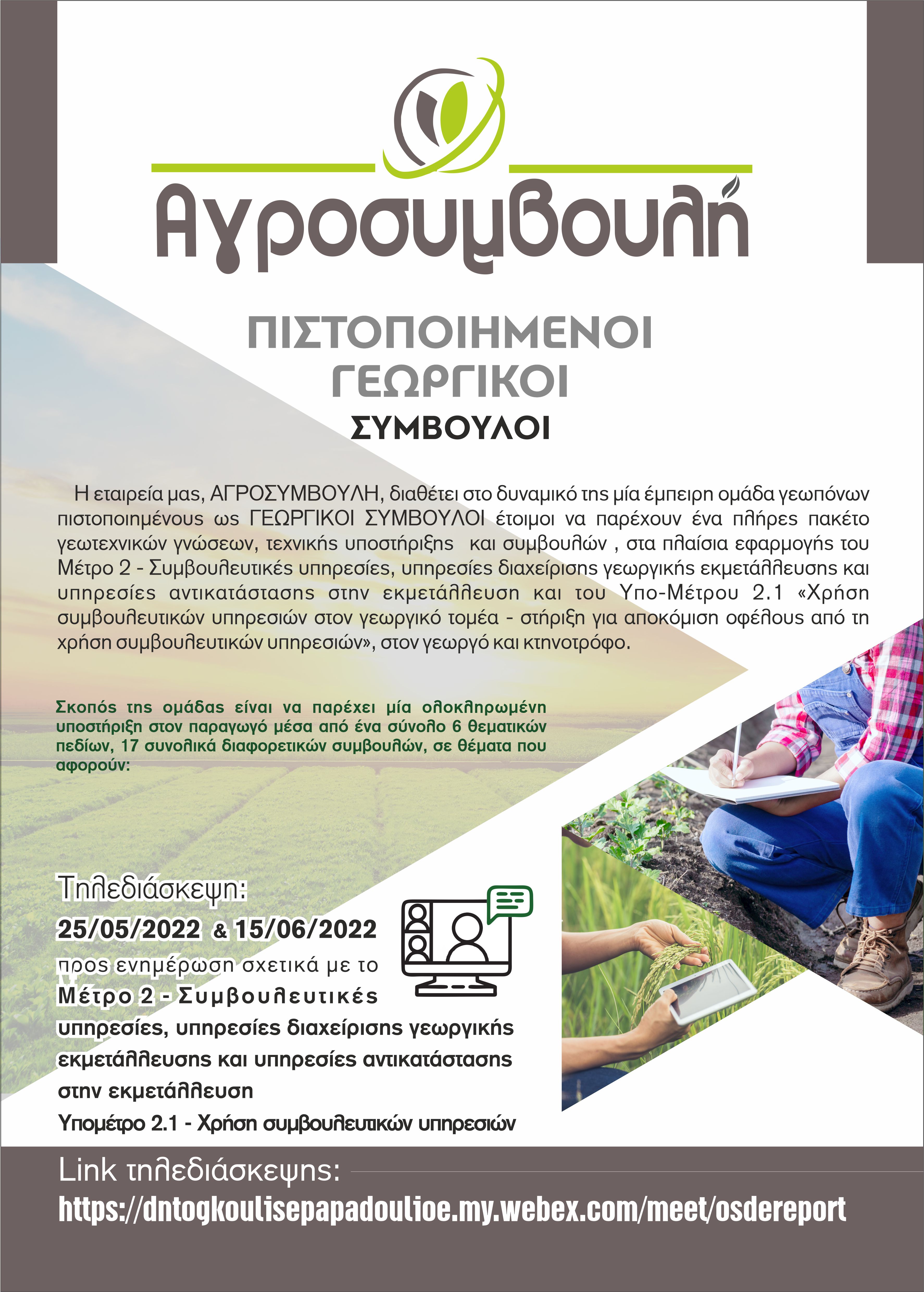 Σας ενημερώνουμε ότι θα πραγματοποιηθεί τηλεδιάσκεψη προς ενημέρωση σχετικά με το μέτρο 2 – Υπομέτρο 2.1 Χρήση συμβουλευτικών υπηρεσιών.